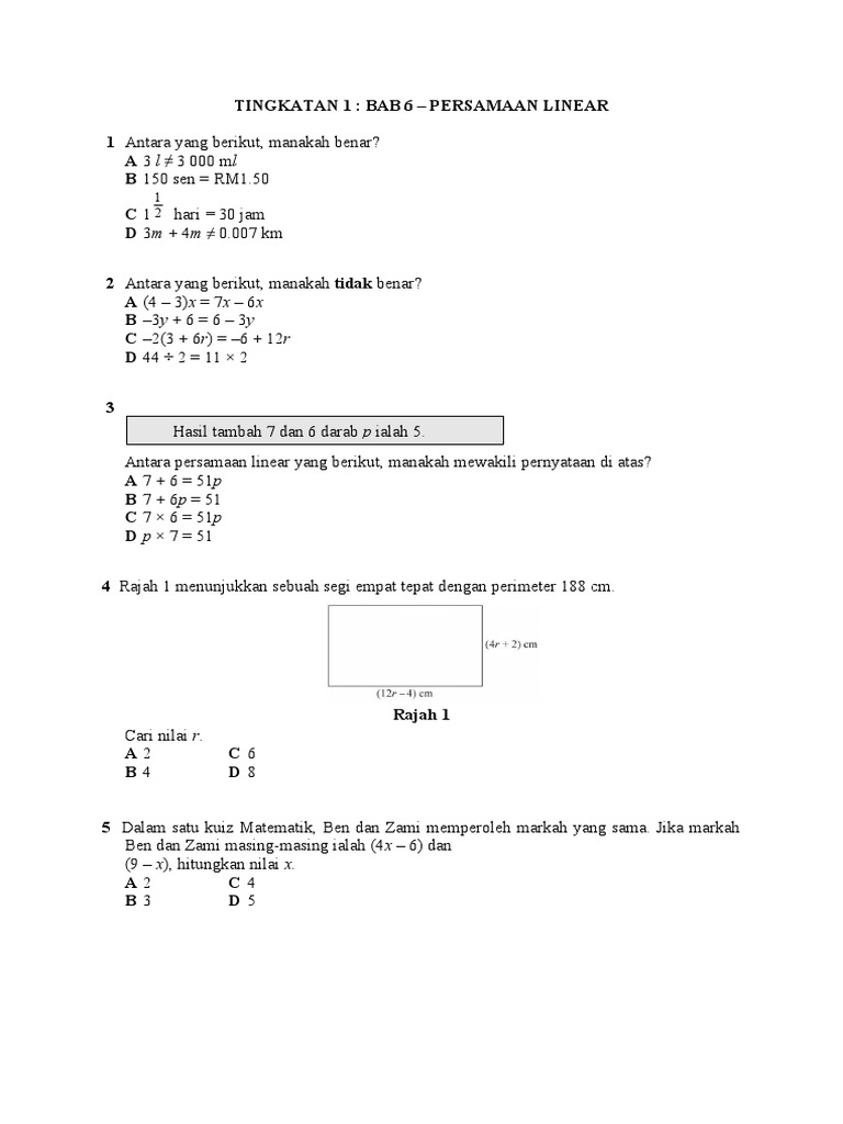 Soalan Persamaan Linear Tingkatan 1 Pdf. Latihan matematik tingkatan 1 + jawapan : To browse pdf files, you need adobe acrobat reader.