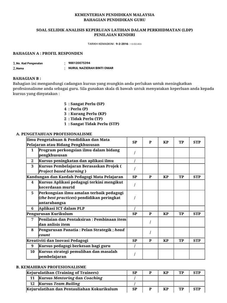 Soal selidik kajian impak program latihan ikhtisas (li) terhadap perkembangan kemajuan kompetensi staf. Institut pegawai kanan tentera darat. Kursus atau latihan dalam meningkatkan profesionalisme b. Malaysia bagi semua pegawai yang telah menghadiri kursus dalam dan luar .
